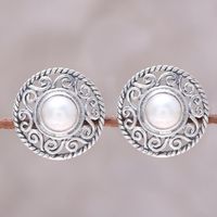Cultured Pearl Sterling Silver Scrollwork Button Earrings 'Crowned Moonlight' Item ID: 2671791322