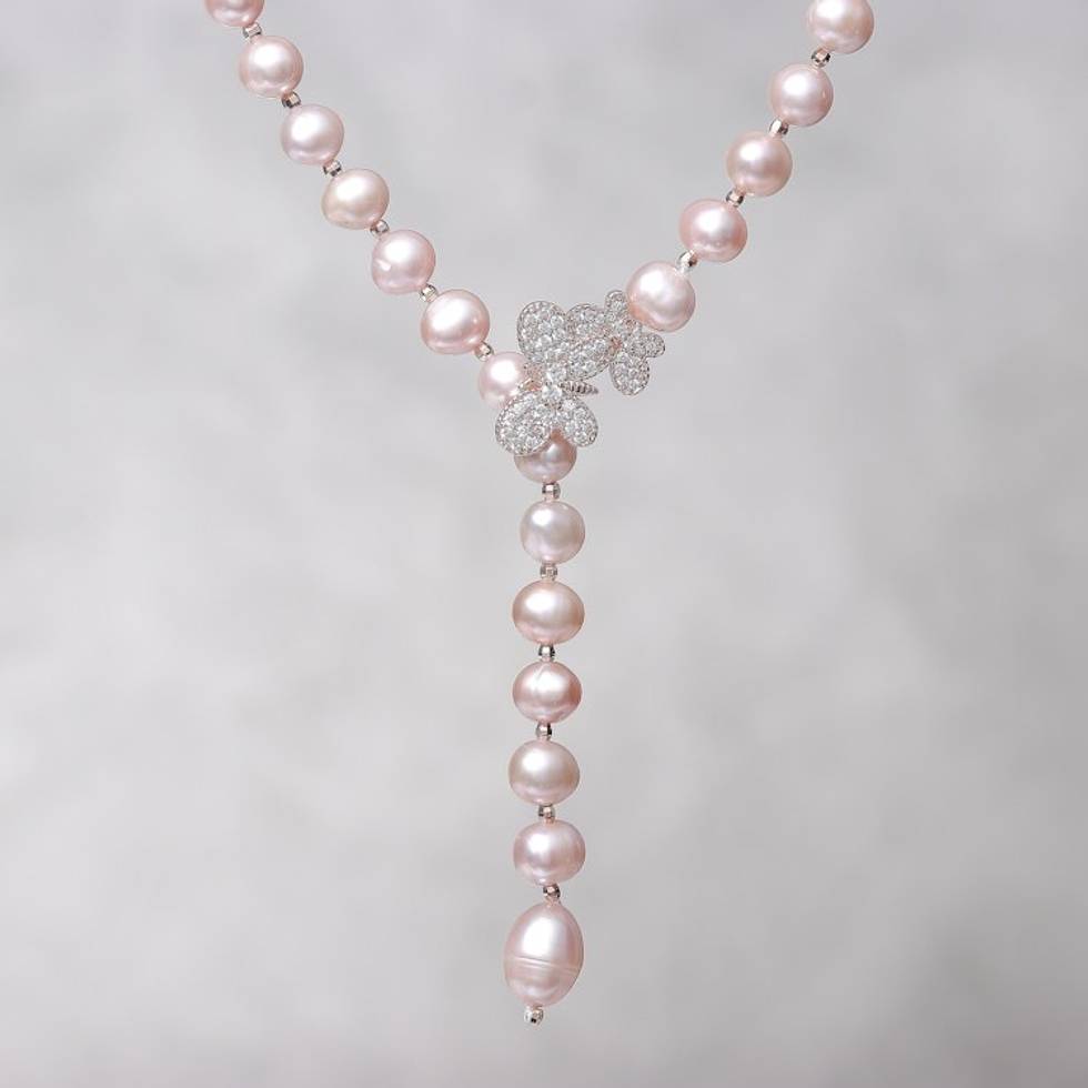 Cultured Pearl Y-Necklace in Pink from Thailand 'Beautiful Butterfly in Pink' Item ID: 2669926220