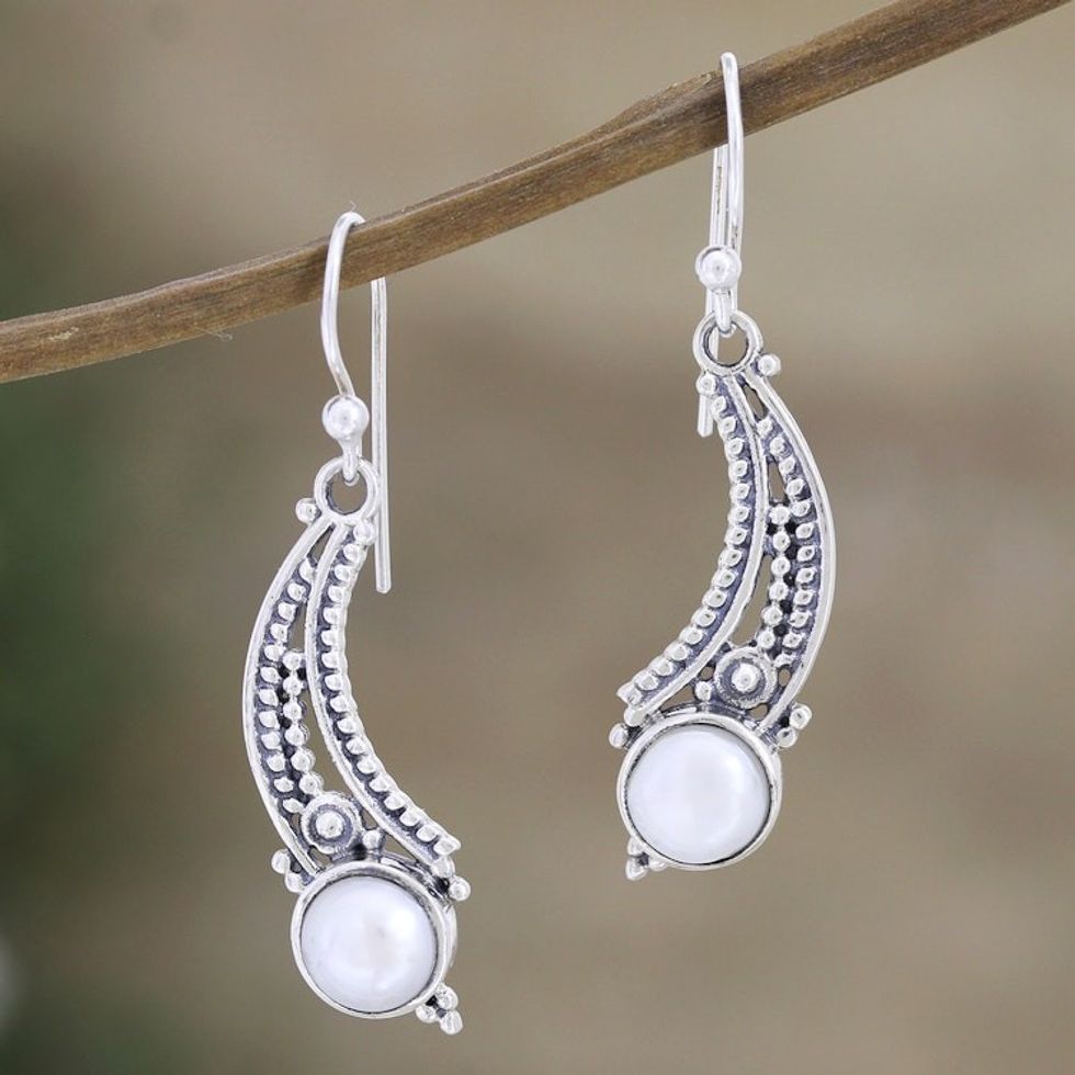 Cultured Pearls Sterling Silver Dangle Earrings from India 'Moon Vines' Item ID: 2671787330