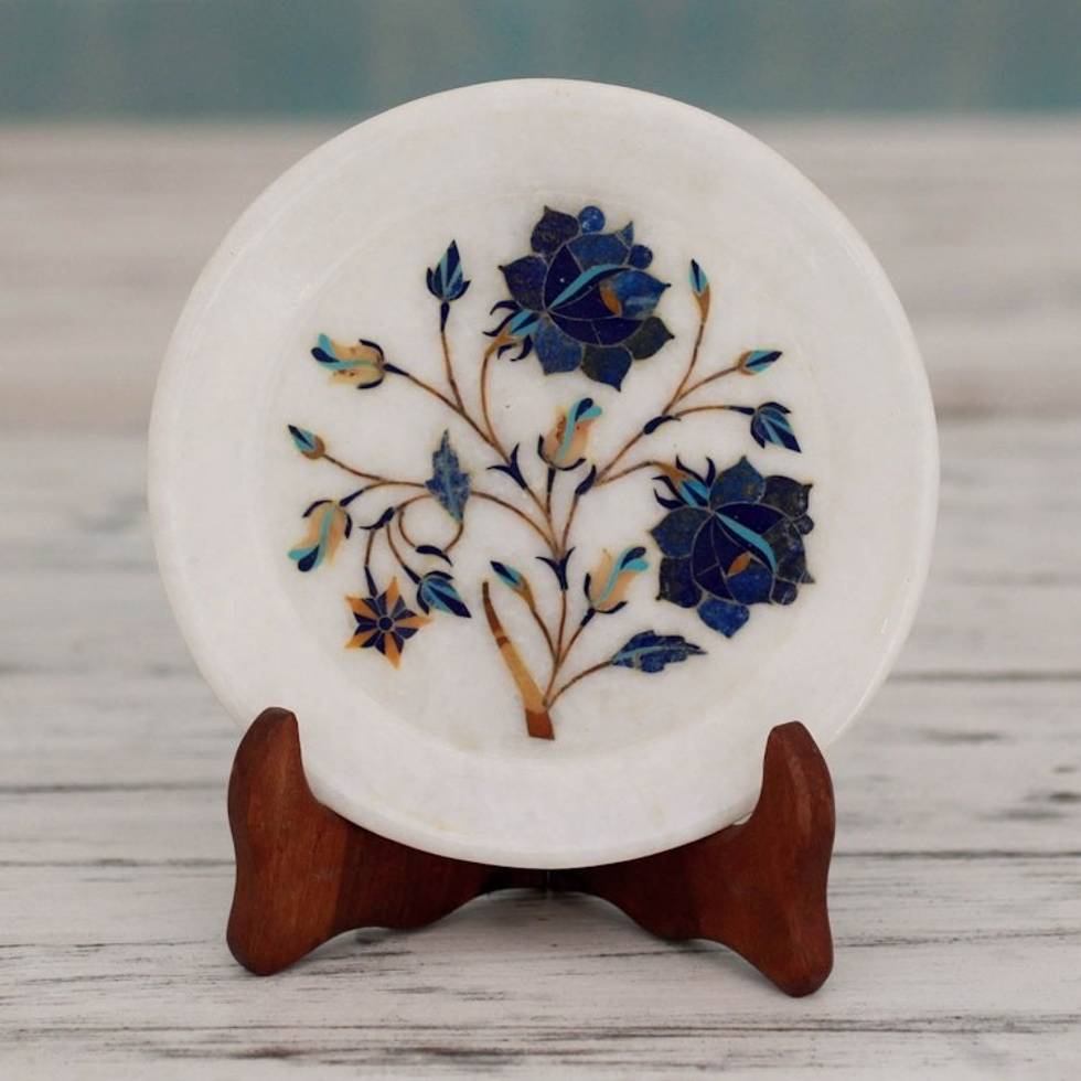 Daisy Motif Marble Inlay Decorative Plate from India 'Blue Daisies' Item ID: 2671792264