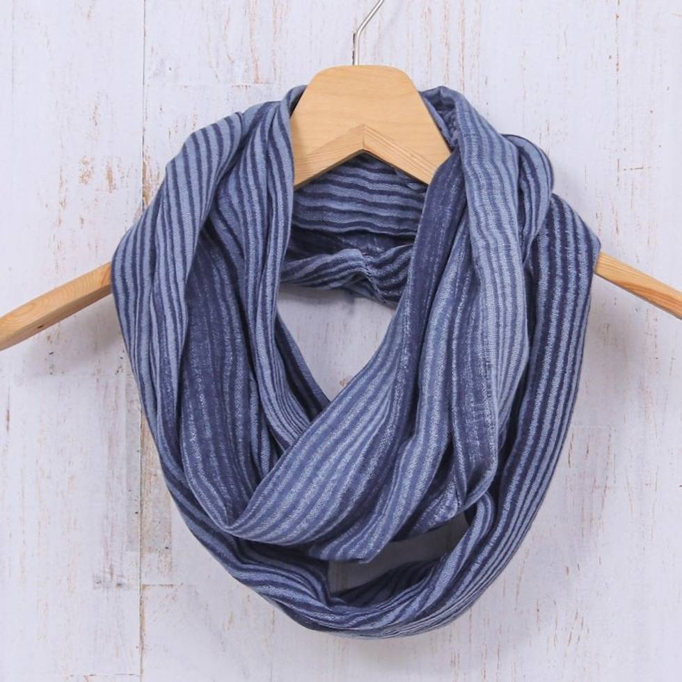 Dark Blue and White 100 Cotton Infinity Scarf from Thailand 'Foggy Night' Item ID: 2671641374