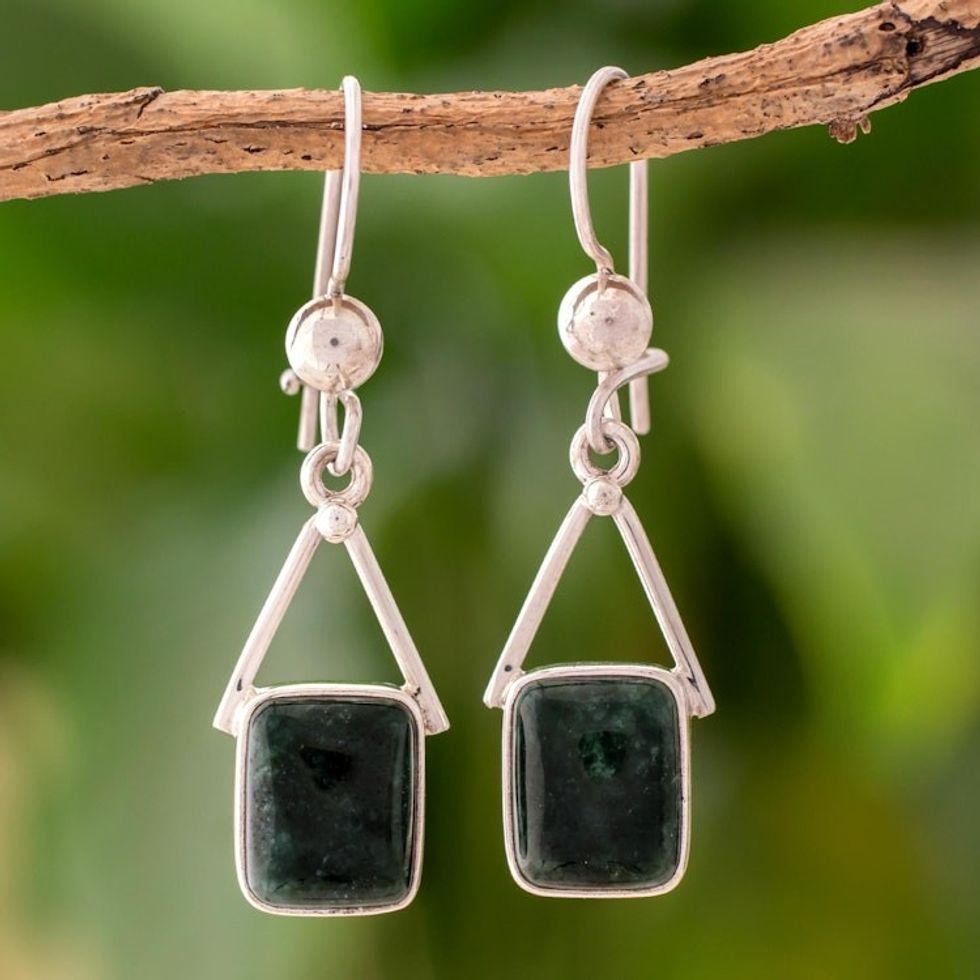 Dark Green Jade Dangle Earrings from Mexico 'Mayan Peaks in Dark Green' Item ID: 2671626006