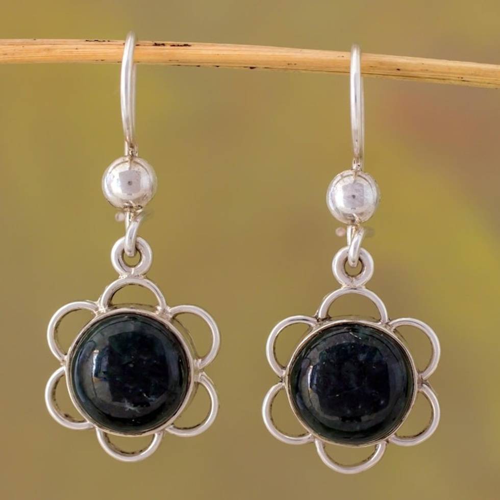 Dark Green Jade Flower Shaped Dangle Earrings from Guatemala 'Country Flower in Dark Green' Item ID: 2671778353