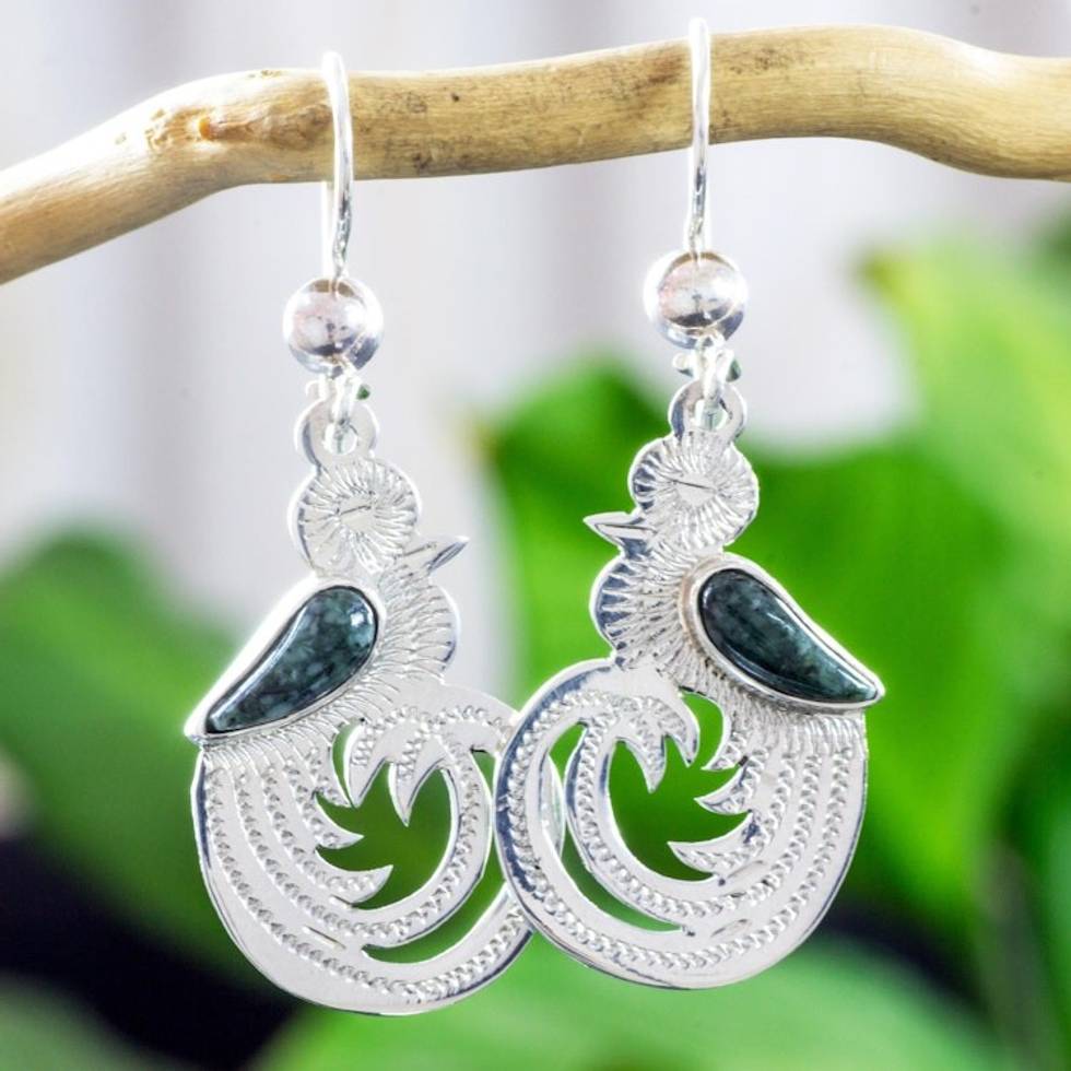 Dark Green Jade on Handmade Sterling Silver Bird Earrings 'Quetzal Beauty' Item ID: 2669934108