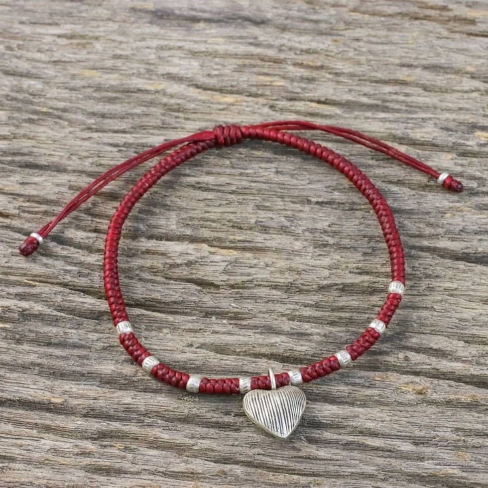 Dark Red Braided Cord Bracelet with Hill Tribe Silver 'Ancient Heart in Red' Item ID: 2671800898