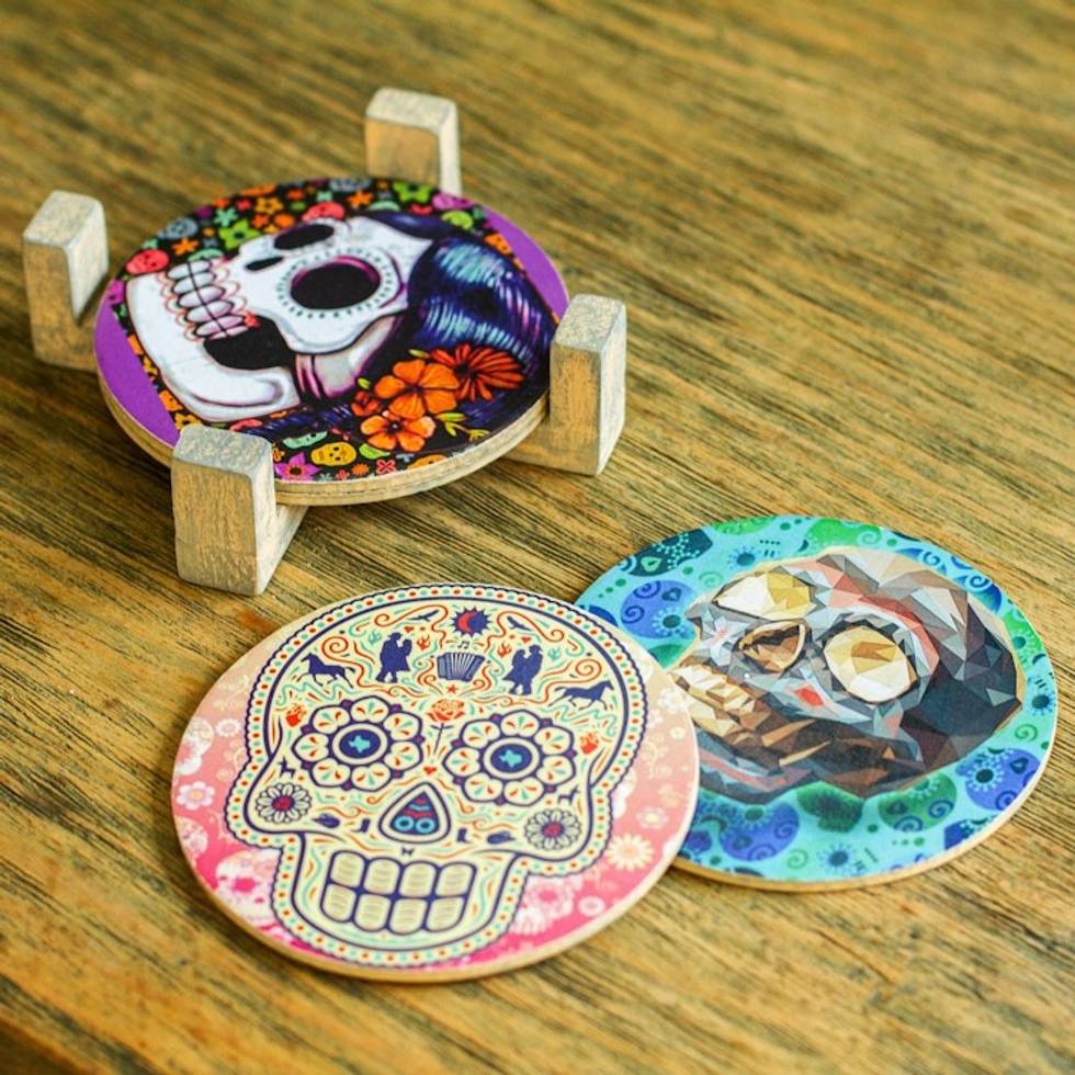 I have a friend who throws a fabulous costume party every halloween. He's got every skeleton, ghoul and witch you can imagine. But He didn't have these Day of Dead coasters. Glad I found them!