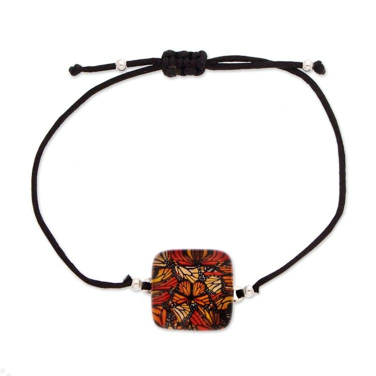 "Celebrate the beauty of the monarch butterfly with this vibrant decoupage glass pendant bracelet. The rich colors stand out against the polished sterling silver beads and the black, adjustable black silk cord that ensures versatility. Created by Mexican artisans Yareth and Daniel, it's a stunning piece that brings nature's elegance to your wardrobe."