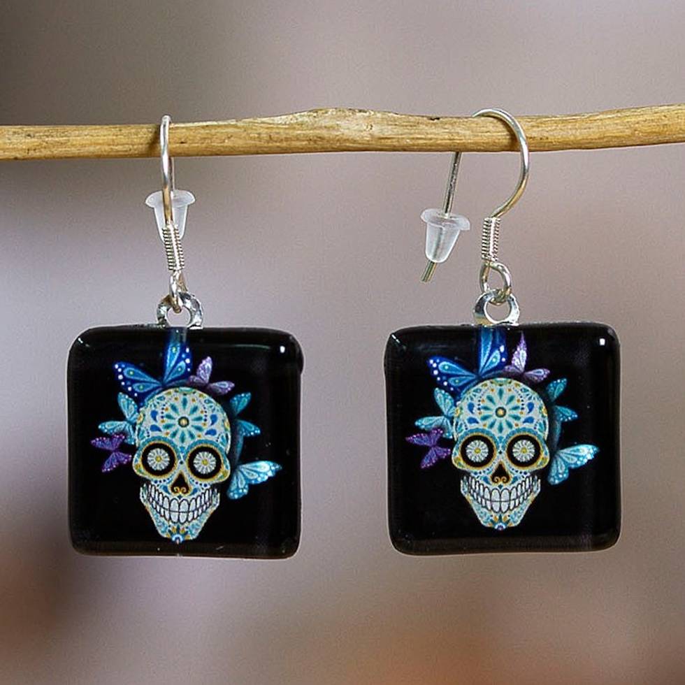 "Stand out with these decoupage glass dangle earrings featuring the iconic Catrina, the popular Day of the Dead icon, adorned with lively butterfly and floral motifs. Finished with polished sterling silver hooks, Mexican artisans Yareth and Daniel's design brings cultural artistry into an everyday accessory."