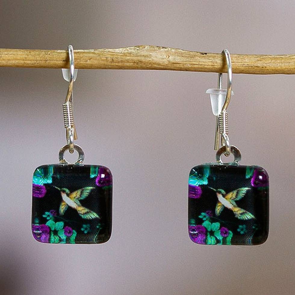 Decoupage on Glass Earrings with Hummingbird Floral Motifs 'Petite Hummingbird Nature' Item ID: 2671798726