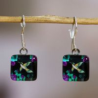 "With lively hummingbirds flying amongst vibrant blossoms, these decoupage on glass dangle earrings feel like a snapshot of nature. Mexican artisans Yareth and Daniel's chic creation is finished with polished sterling silver hooks, adding a dash of elegance to your look."