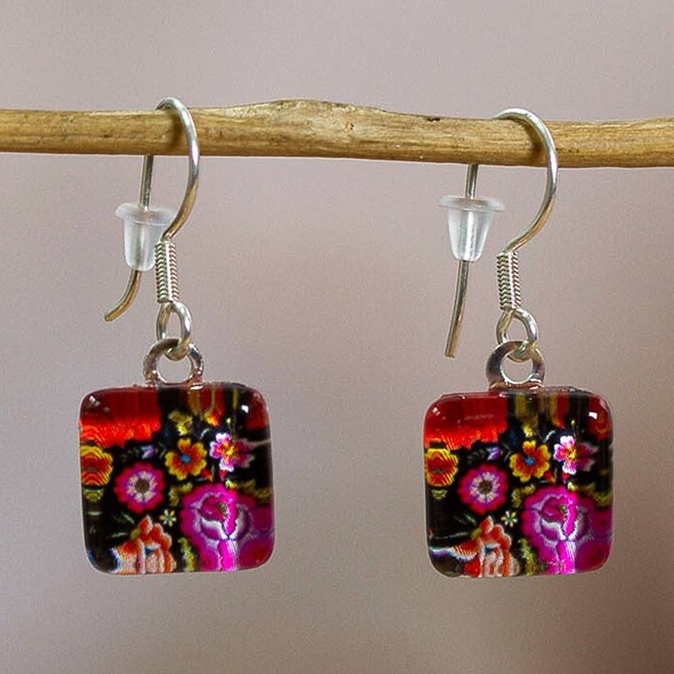 Decoupage on Glass Earrings with Oaxaca Embroidery Motif 'Petite Oaxacan Garden' Item ID: 2671652043