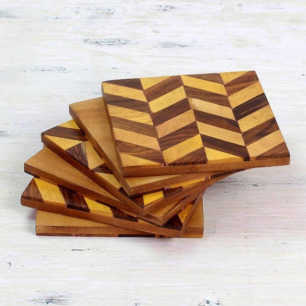 Diagonal Motif Mango Wood Coasters from India Set of 6 'Diagonal Elegance' Item ID: 2669944185