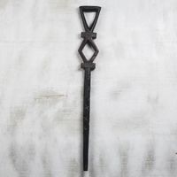 "Perfect for casual use or simply as wall decor, this walking stick from Ghana is presented by Eva Asantewa Amakye. Hand-carved from sese wood with embossed aluminum accents, this brown and black walking stick is a true work of art. Just below the handle, an open diamond shape is carved from the wood."