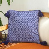 "Diamonds and circles converge in an all-over pattern on this cushion cover from Margarita Ruiz in Mexico. The artisan weaves the deep blue cover on a traditional pedal loom from 100% cotton, adding tassels to the four corners. A zipper on the back allows for the insertion of a cushion."