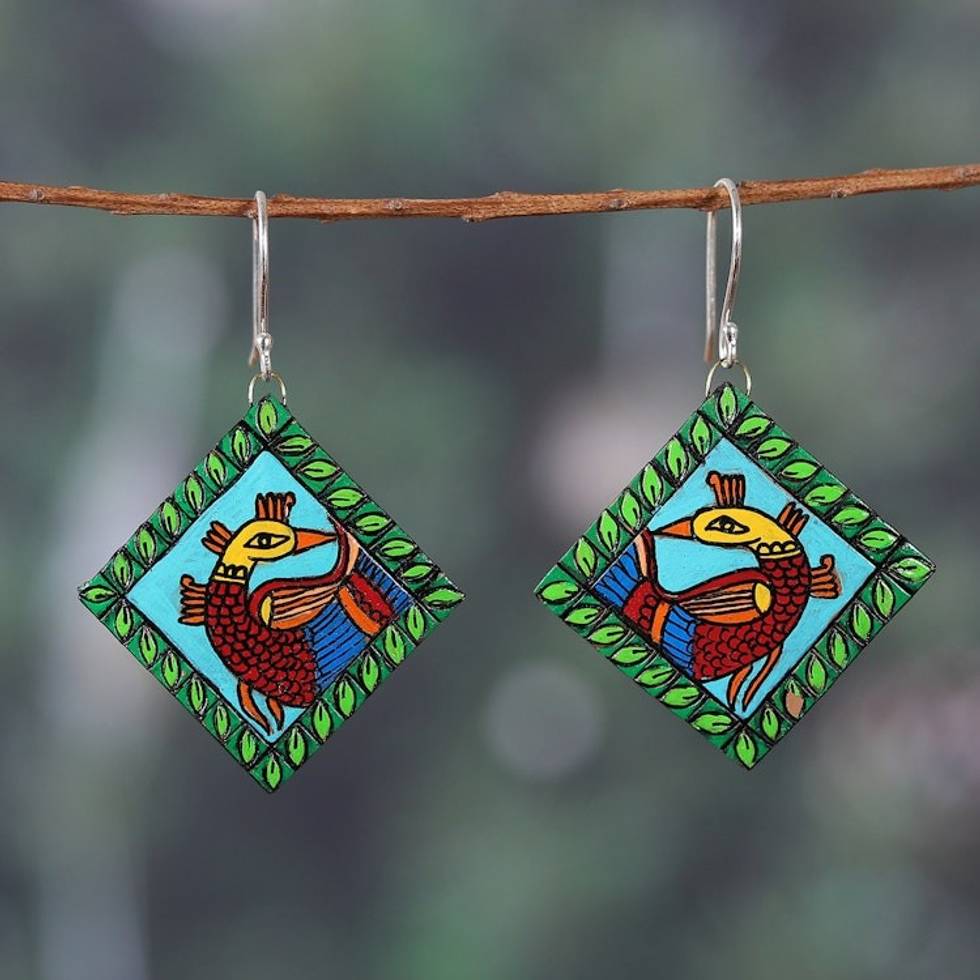 Diamond-Shaped Peacock Green Ceramic Dangle Earrings 'Kalamkari Peacock' Item ID: 2671786825
