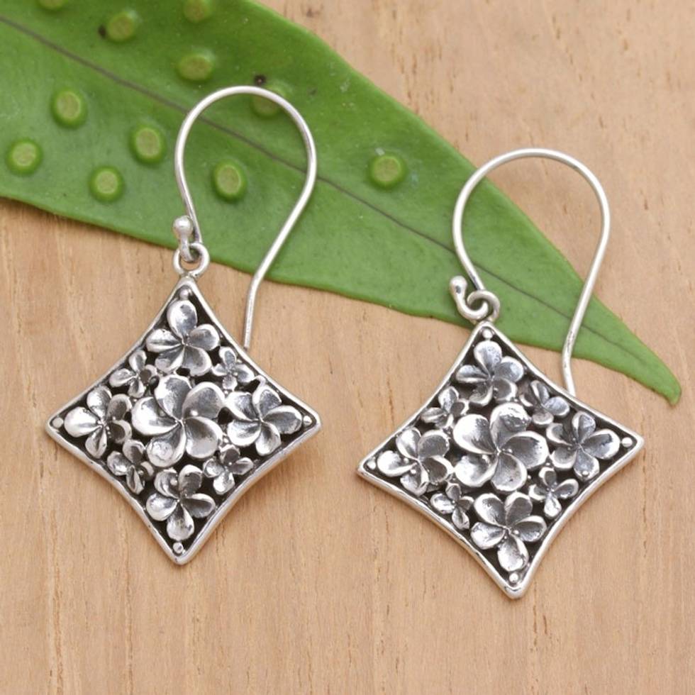 "The colorful flowers of Bali add an enchanting touch to the natural landscapes, inspiring Karang Adiguna to create a charming accessory full of that unique sensation the island offers. Working with sterling silver, the artisan crafts these diamond-shaped dangle earrings with frangipani blooms ornamenting the design, all in a combination finish for a lustrous look."