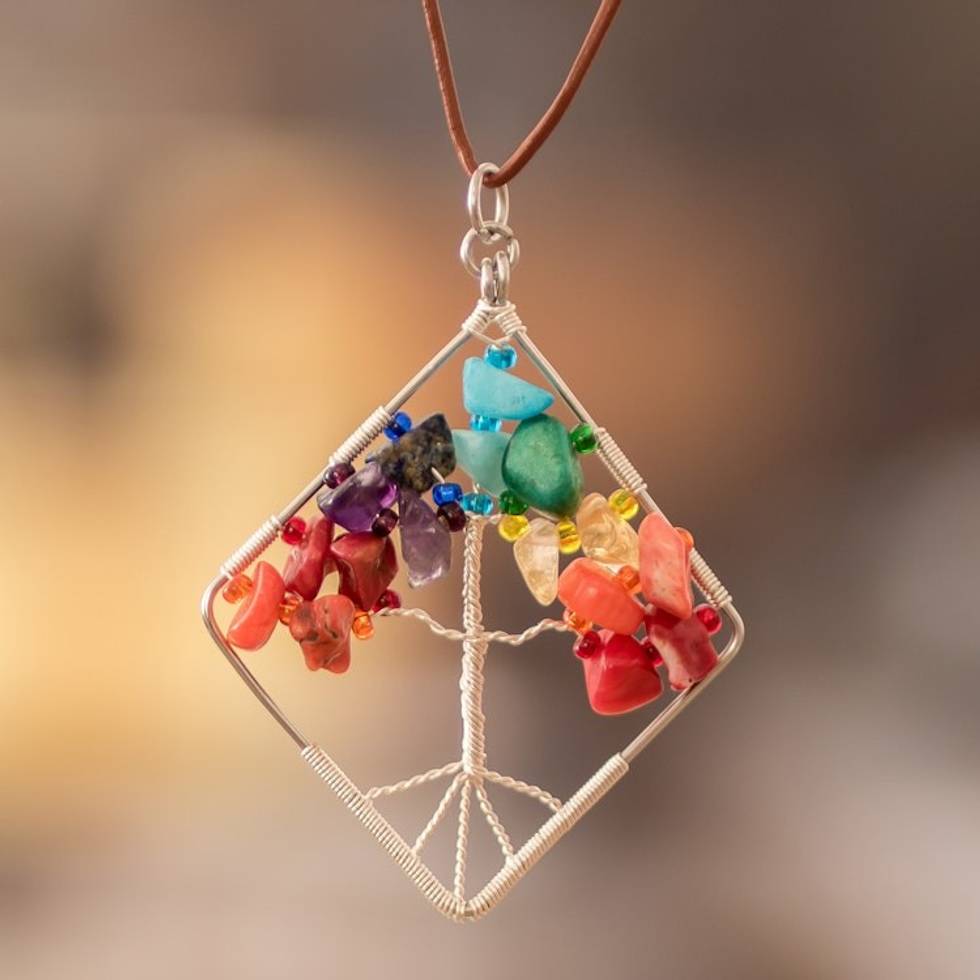 Diamond-Shaped Tree-Themed Multi-Gemstone Pendant Necklace 'Nature's Rainbow Diamond' Item ID: 2669923745