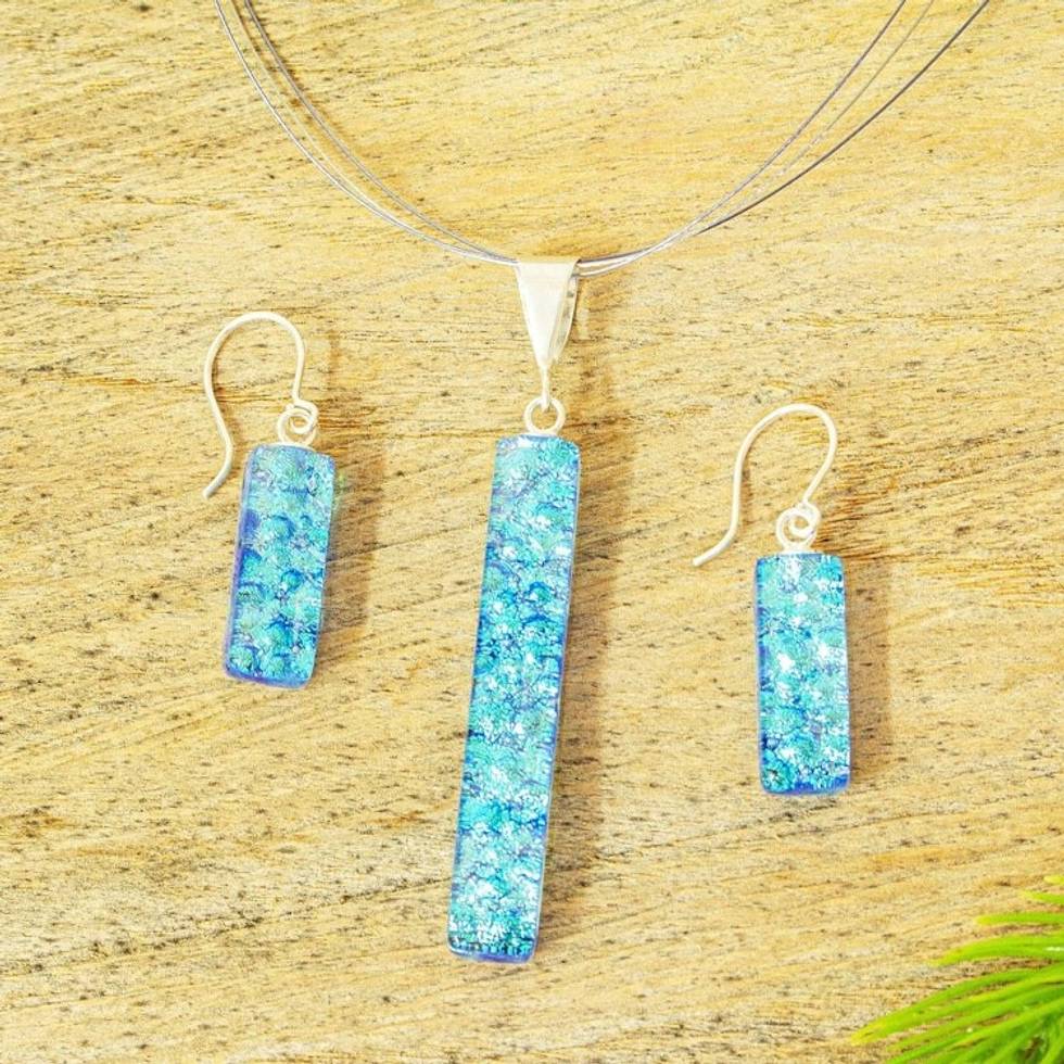 Dichroic Art Glass Icy Blue Necklace Earrings Set 'Crystalline Sky' Item ID: 2671808299