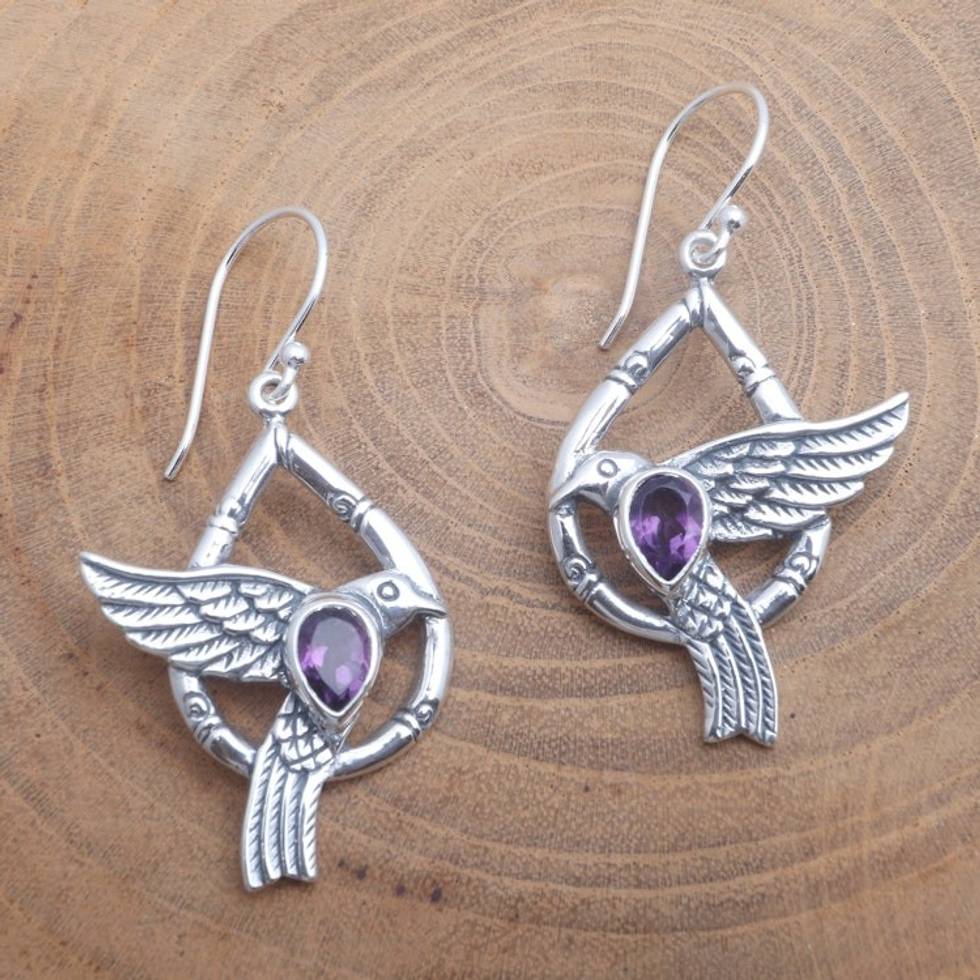 Dove-Themed Faceted Amethyst Dangle Earrings from Bali 'Bamboo Doves' Item ID: 2671821211