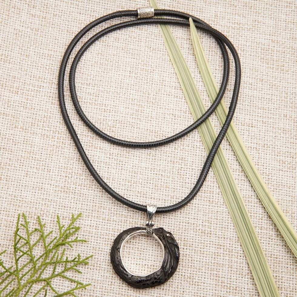 "Embodying wisdom, strength and divinity, the dragon's spirit blesses this magnificent necklace crafted by Maria and Gennadii in Bali. Made on a round sterling silver structure, the accessory features a hand-carved depiction of this mythical creature, all made from a horn in a natural dark hue that adds a mysterious vibe to the piece."