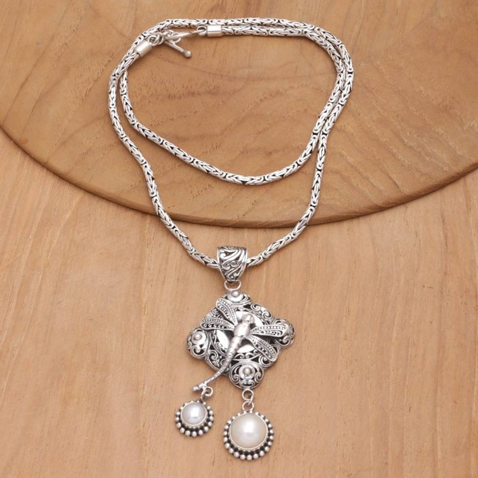 Dragonfly Cultured Pearl Pendant Necklace from Bali 'Noble Dragonfly' Item ID: 2669923225