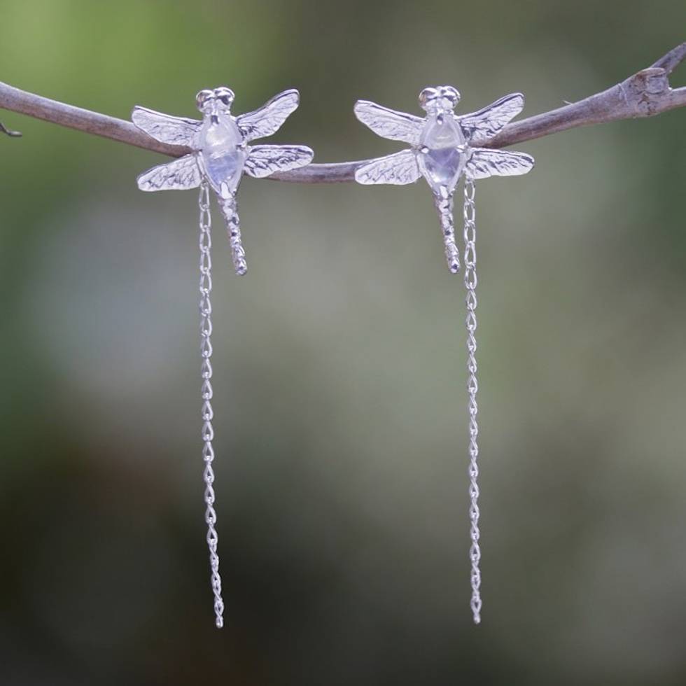 "Let the radiant aura of these dragonflies fill your outfits with a serene and heavenly vibe. Crafted by Bali's Astiti Pratiwi, these sterling silver dangle earrings draw inspiration from those sweet bugs, symbolizing change and adaptability. Embellished with a high polish finish, the accessory comes with hanging chains and natural rainbow moonstones in a charming color, attracting harmony."