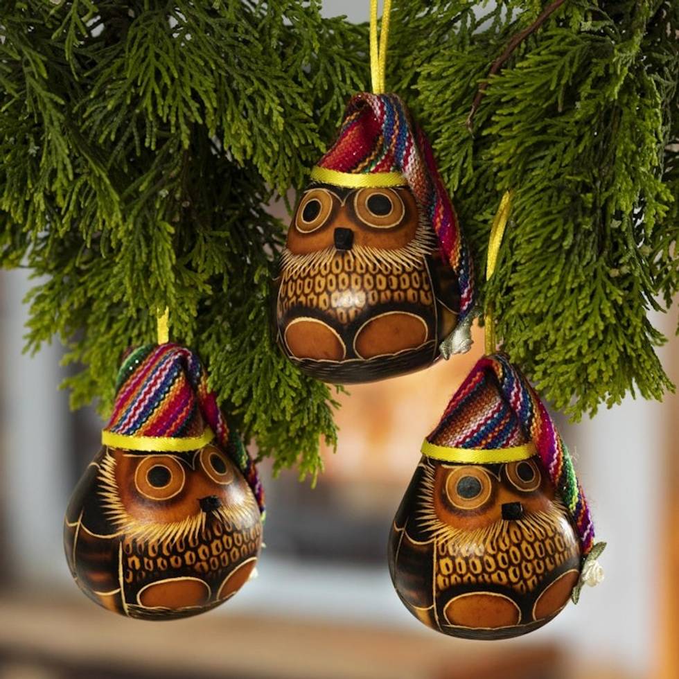 Dried Mate Gourd Owls Ornaments Wearing Hats Set of 3 'Holiday Owls' Item ID: 2671695459