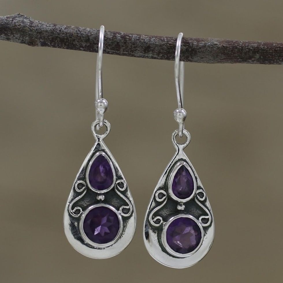Drop-Shaped Amethyst Dangle Earrings from India 'Complex Drops' Item ID: 2671619707