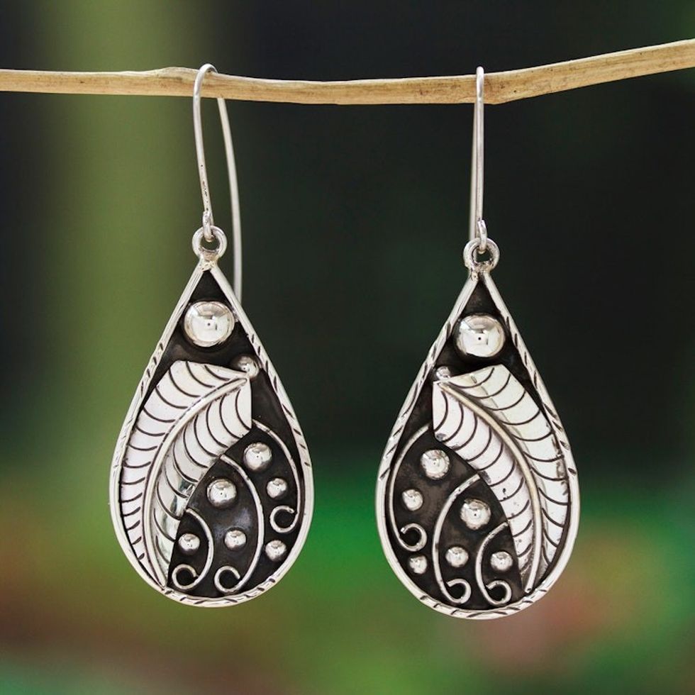 Drop-Shaped Leafy Sterling Silver Dangle Earrings 'Tears from Nature' Item ID: 2671639114