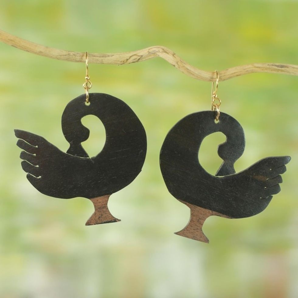 Ebony Wood Adinkra Bird Dangle Earrings from Bali 'Adinkra Roots' Item ID: 2671803817