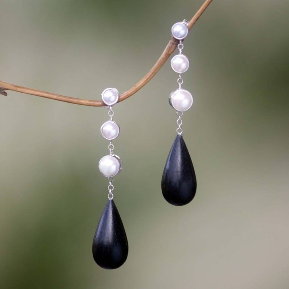 Ebony Wood and Pearl Dangle Earrings 'Night Tear' Item ID: 2671698336