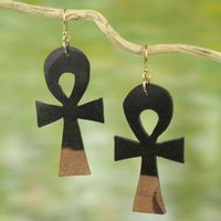 Ebony Wood Ankh Cross Dangle Earrings from Ghana 'Life Ankhs' Item ID: 2671803891