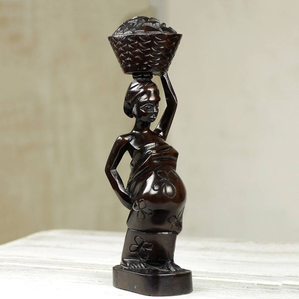 "She steadies herself with one hand on her back while the other balances a basket full of fruit on her head. Her belly swells with new life. Dressed in a flowery sarong, she remains ahokeka, or 'active' in the Akan language. Designed by Agnes Amponsah, this admirable ebony wood sculpture is carved by hand in Ghana."