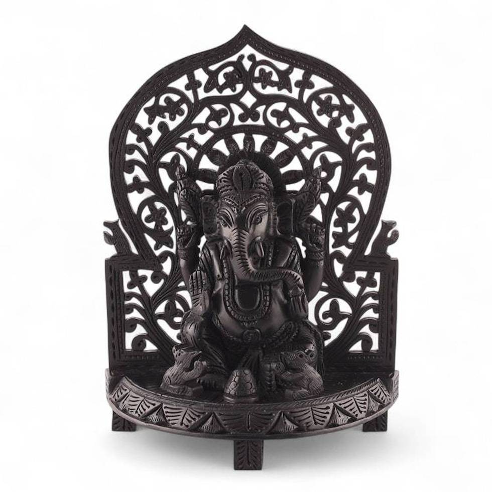 "The Hindu god Ganesha takes form in striking ebony, perched gracefully on a detailed pedestal and adorned with an exquisite crown, jewelry and attire. The small modak in front of him symbolizes prosperity while the surrounding mouse figures honor his traditional vahana. The arched floral and vine jali backdrop brings depth to every angle of this sculpture designed by India's Motilal and Ayush, making it a distinguished addition to any room."
