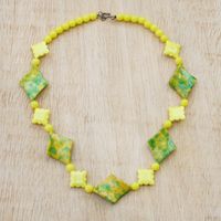"It's hard to believe the bright green and yellow beads on Elizabeth Alorchie-Apetor's colorful necklace are made from recycled plastic. Hand crafted in Ghana, the eco-friendly necklace features an alternating beaded pattern and a brass hook clasp."