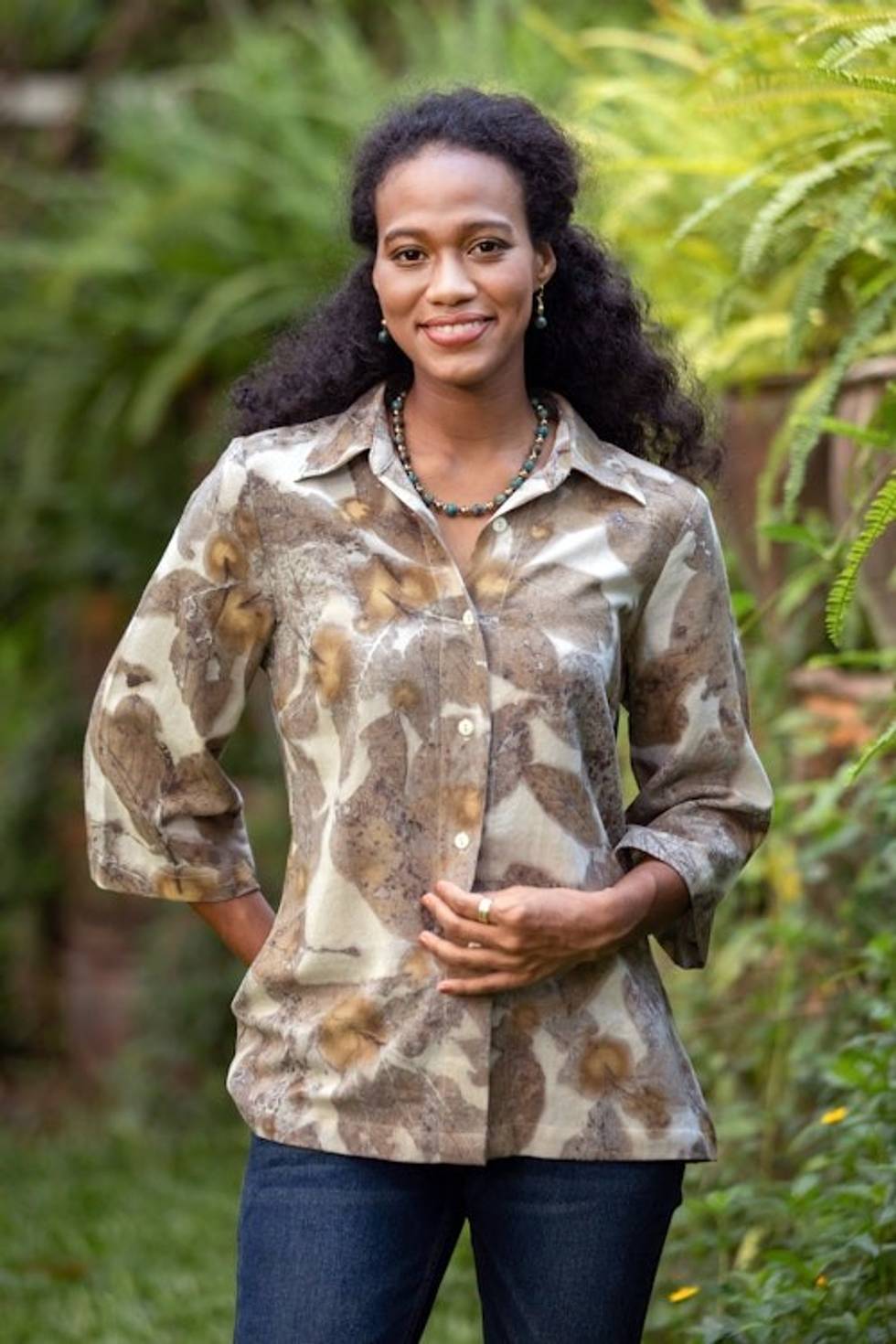 Eco-Friendly Cotton Leaf-Motif Collared Shirt 'Ivory Botanicals' Item ID: 2669892426