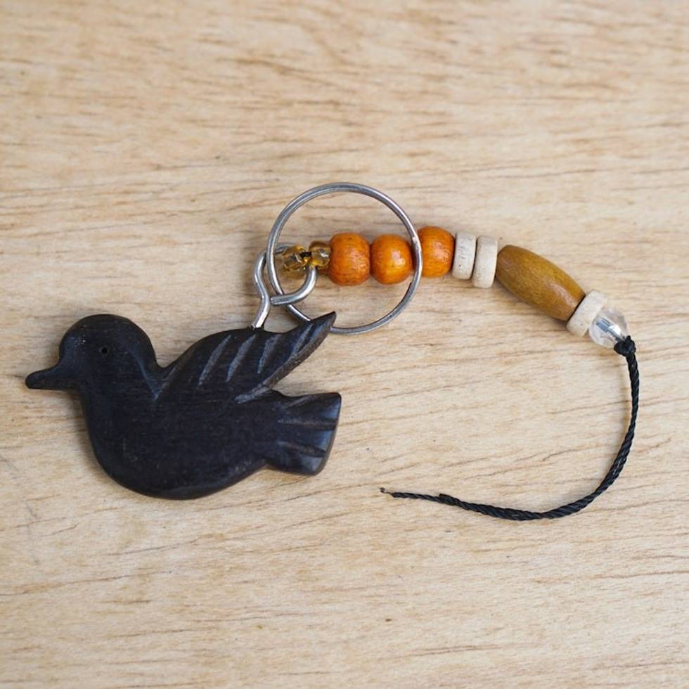 Eco-Friendly Ebony Wood Bird Keychain with Recycled Beads 'Flying Amulet' Item ID: 2671197204