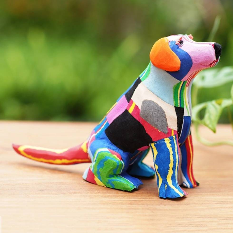 "Working to clean up oceans and waterways, recycle, and employ the local community, Ocean Sole of Kenya creates amazing, colorful sculptures from recycled flip-flops. This sweet sitting dog sculpture is formed and hand-carved from approximately 8 flip-flops, and can take as much as 7 hours to create. Each dog is unique with variations in color, pattern and placement as seen in the example photo."