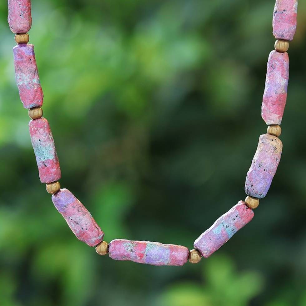 Eco-Friendly Pink Recycled Paper and Brass Beaded Necklace 'Pink Senses' Item ID: 2671797756