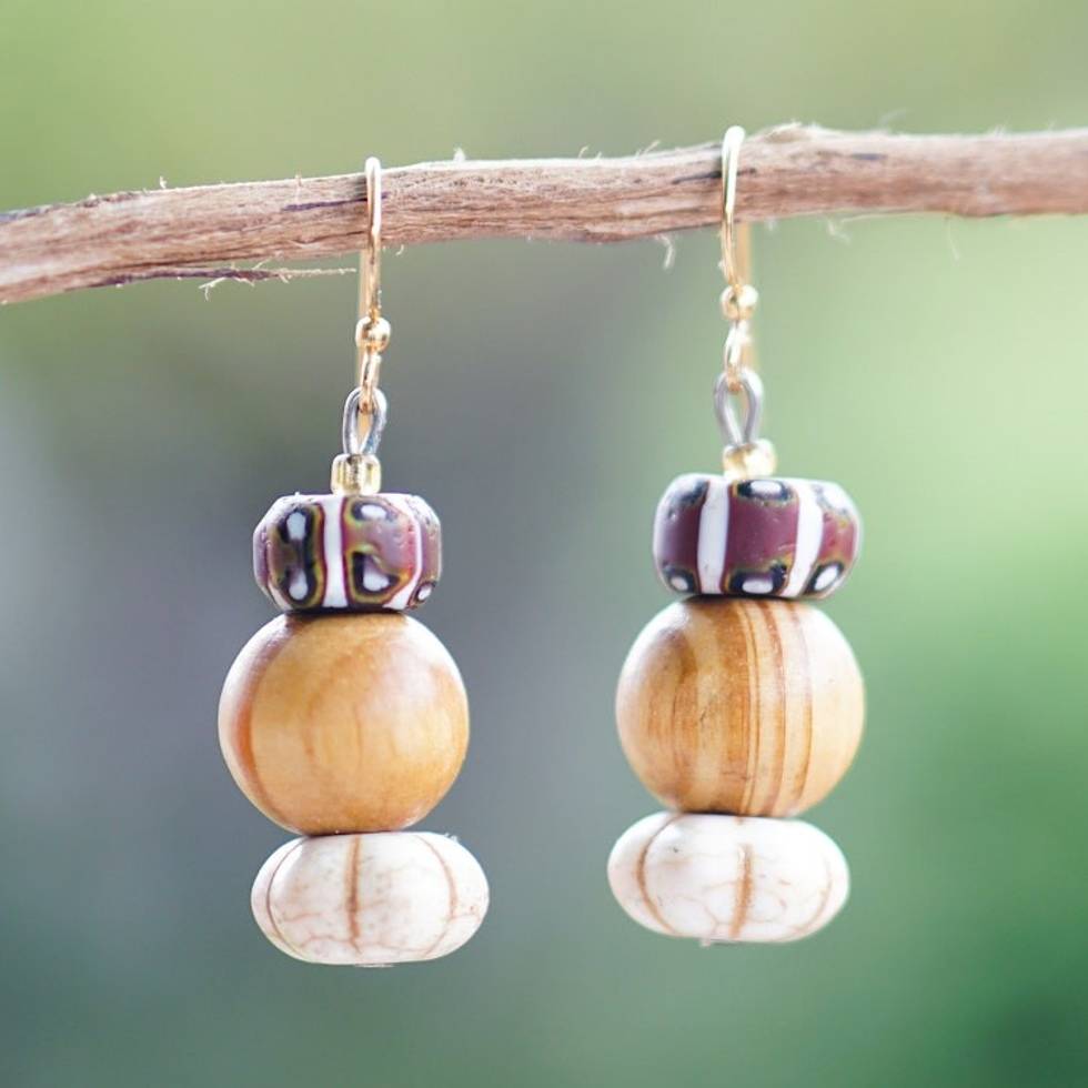 Eco-Friendly Recycled Glass and Wood Beaded Dangle Earrings 'Dzika' Item ID: 2671805031