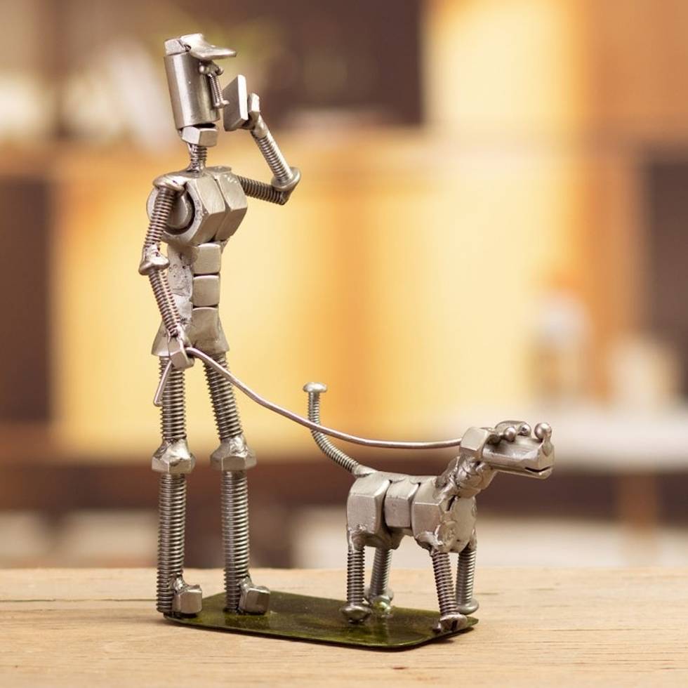 Eco-Friendly Recycled Metal Sculpture of Man and Dog 'Eco Walk' Item ID: 2671697934