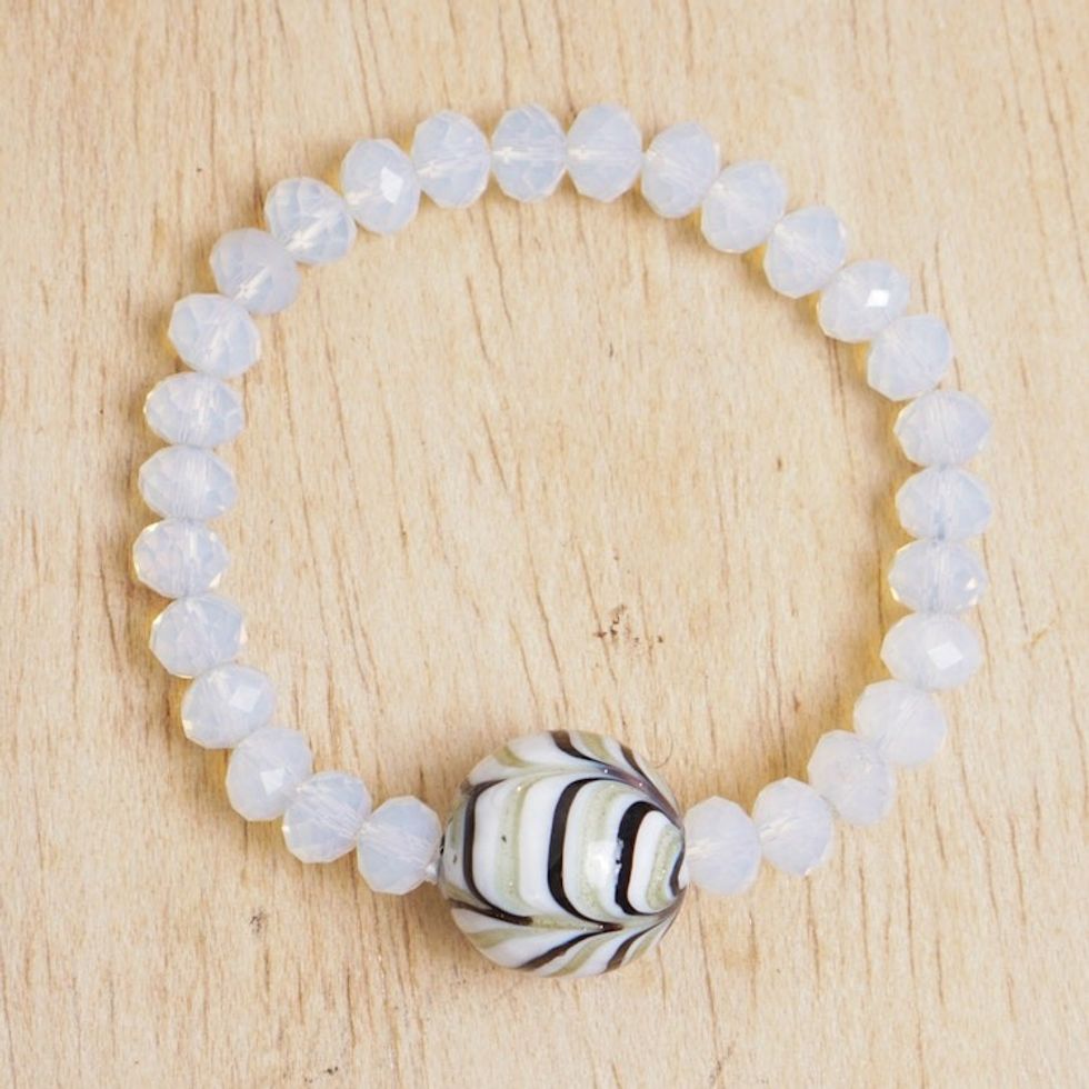 Eco-Friendly White and Black Recycled Glass Beaded Bracelet 'Pure at Core' Item ID: 2671804078