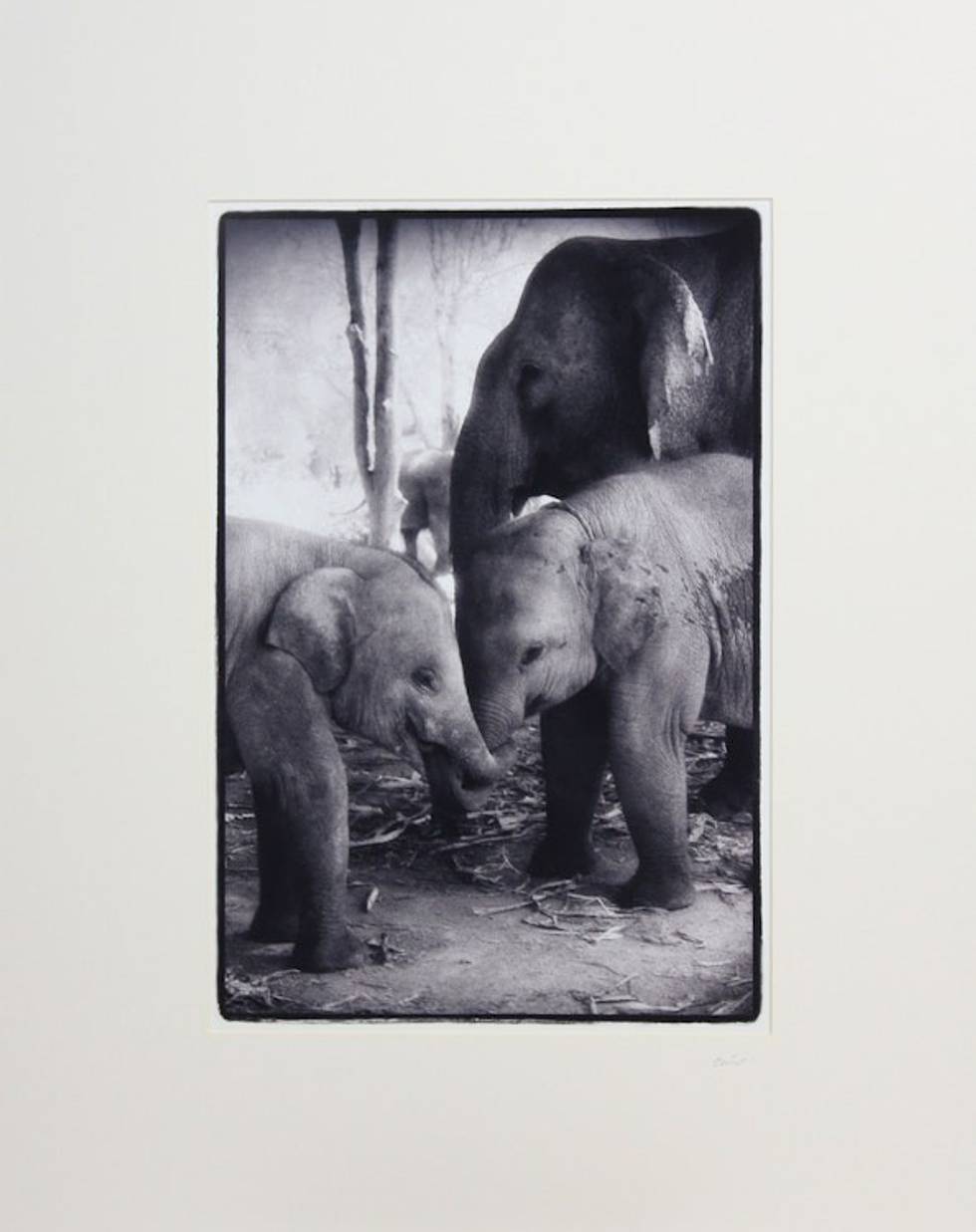"Mama elephant watches over her calves as they entwine their trunks in play in this endearing photograph by Oraphat. In black and white, her photograph captures the pachyderms' noble nature as well as the rugged textures of their skin, and the spark of innocence in the elephants' eyes."