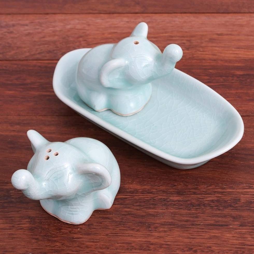Elephant Salt and Pepper Set in Aqua Celadon 3 Pieces 'Cheeky Elephants in Aqua' Item ID: 2671800542