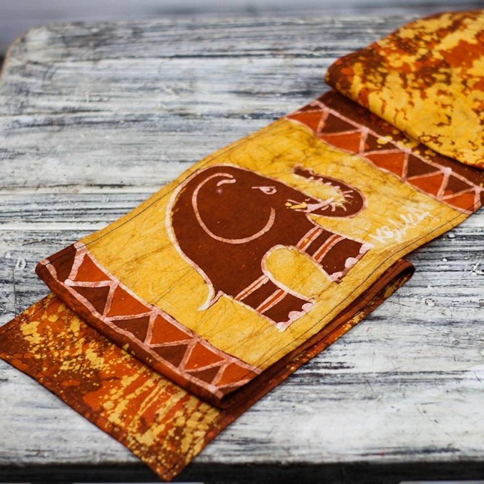 Elephant-Themed Batik Cotton Table Runner from Ghana 'Elephant Wrap' Item ID: 2671806224