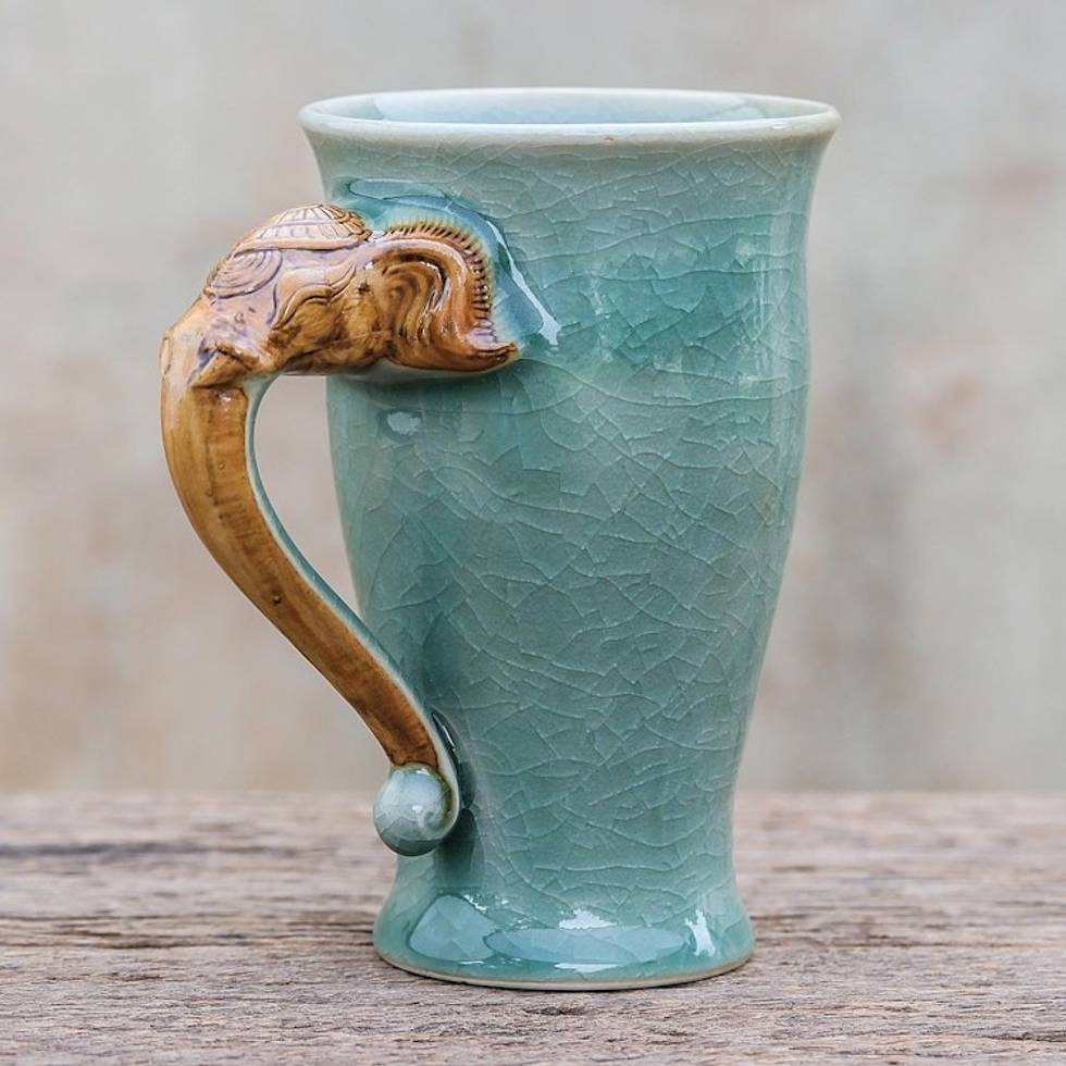 Elephant-Themed Celadon Ceramic Mug from Thailand 'Elephant Handle in Green' Item ID: 2671798973
