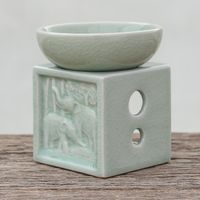 Elephant-Themed Celadon Ceramic Oil Warmer from Thailand 'Elephant Jungle' Item ID: 2669894245