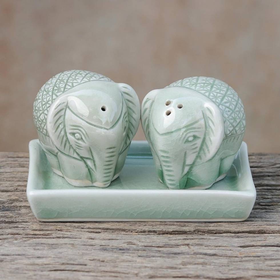 Elephant-Themed Celadon Ceramic Salt and Pepper Shaker Set 'Elephant Texture' Item ID: 2671799540