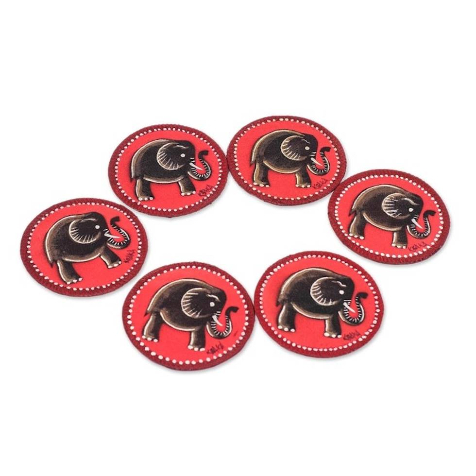 Elephant-Themed Cotton Coasters from Ghana Set of 6 'Red Elephant' Item ID: 2671806270