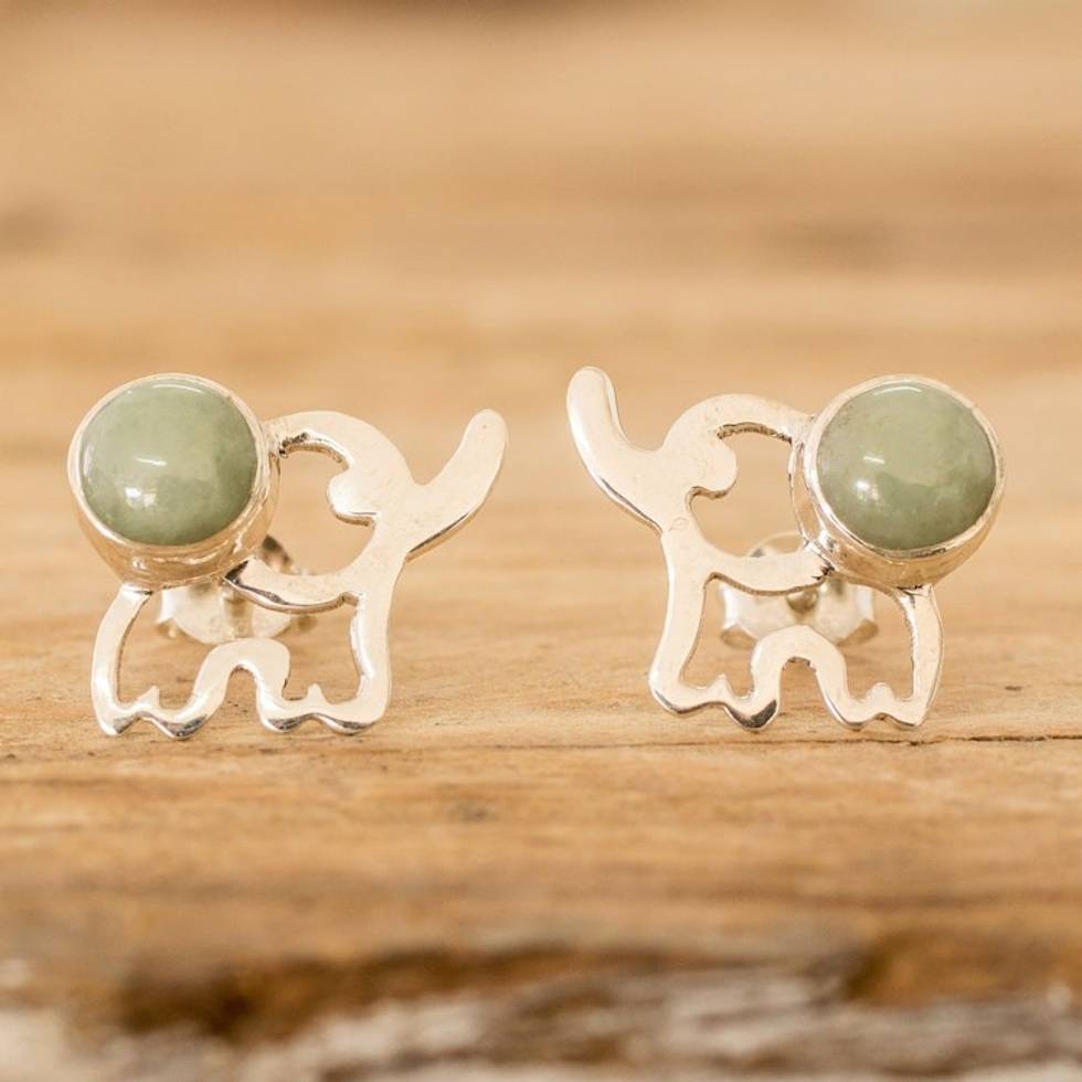 Elephant-Themed Dark Green Jade Button Earrings 'Balance Trunks' Item ID: 2671771138